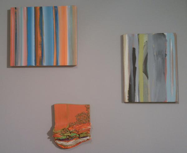 Another wall has Paul Kelpe (1902-1985) as its “godfather,” represented by a small, almost square, architectonic oil painting from around 1925. Radiating out on either side are a dozen recent paintings whose main concerns are surface quality (above right). The heavy impasto of In Natura, 2010 by John Zinsser seems to be informed by Philip Guston’s non-figurative paintings from the 60s (one of which is currently on view at McKee Gallery). In Untitled, 2010 by Nick Lamia, transparent washes in blue and green oils are built up over extremely rough canvas, creating the illusion of a flat, glistening plane. And Three Muses, 2011 by Willy Bo Richardson, with its rough-textured stripes in high-key color, acts as a gleeful bookend for the opening wall of the show. 70 Years of Abstract Painting—Excerpts continues at Jason McCoy Gallery through May 20th. The Fuller Building, 21 East 57th Street, 11th Floor, New York, NY.