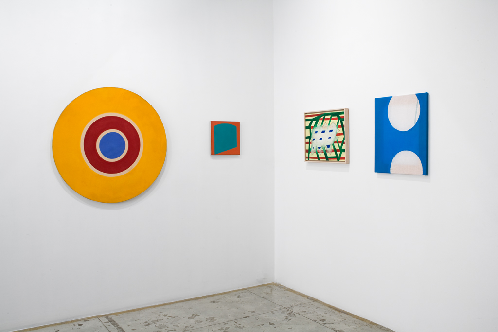 In the back gallery, color takes charge as the guiding principle, starting with a round canvas by Kenneth Nolan (1924-2010), whose red and blue bull’s eye sets the pace for the Op Art attributes of vibrating red and green forms in Correspondence Red-Green, 1967 by Leon Polk Smith (1906-1996); and for the circular cut-outs in Joe Fyte’s, Two Clouds, 2011, which are set off by a super-saturated blue field of gauze fabric.